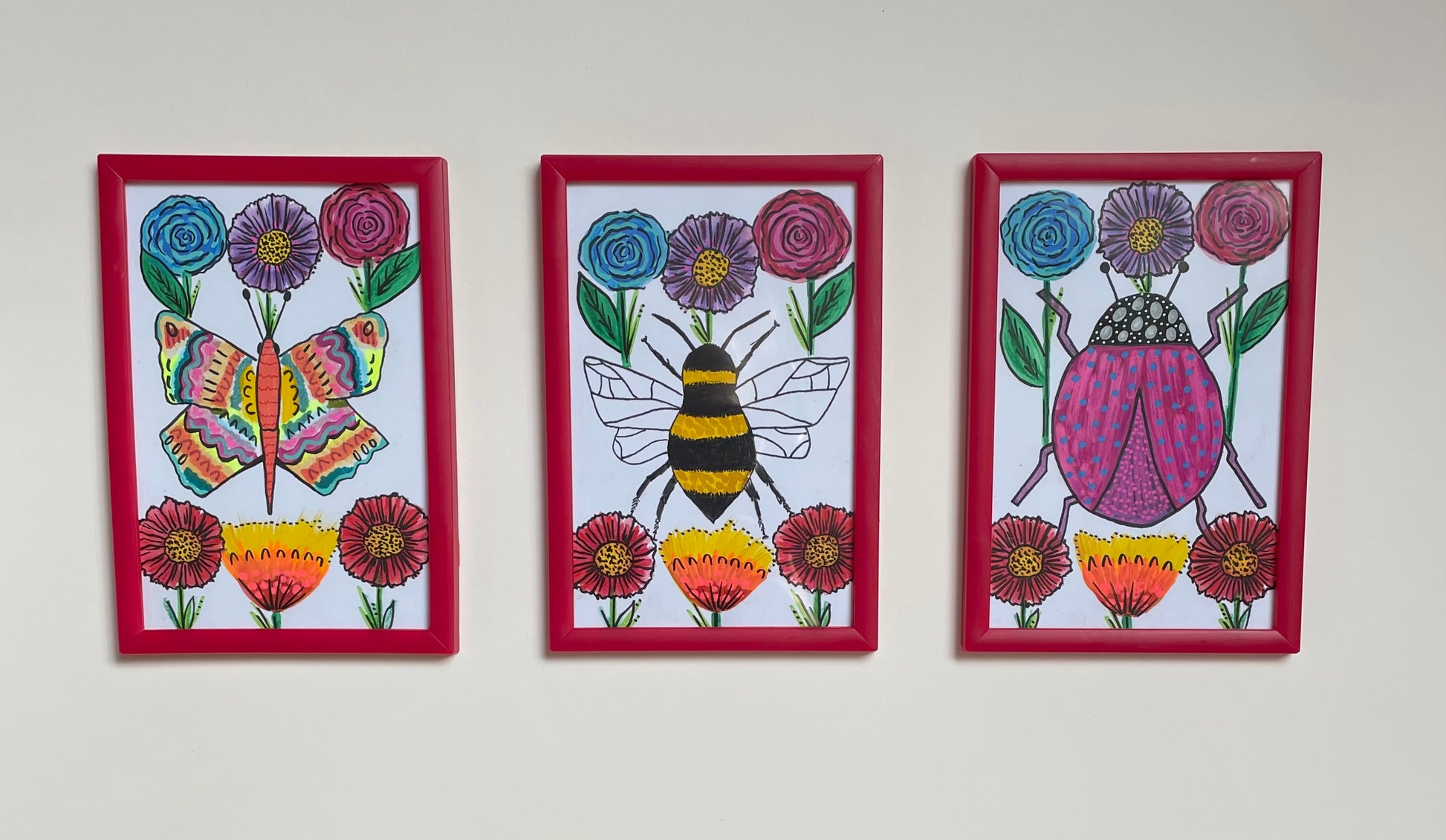 Framed original butterfly, bee and bug painting, each approximately A6.