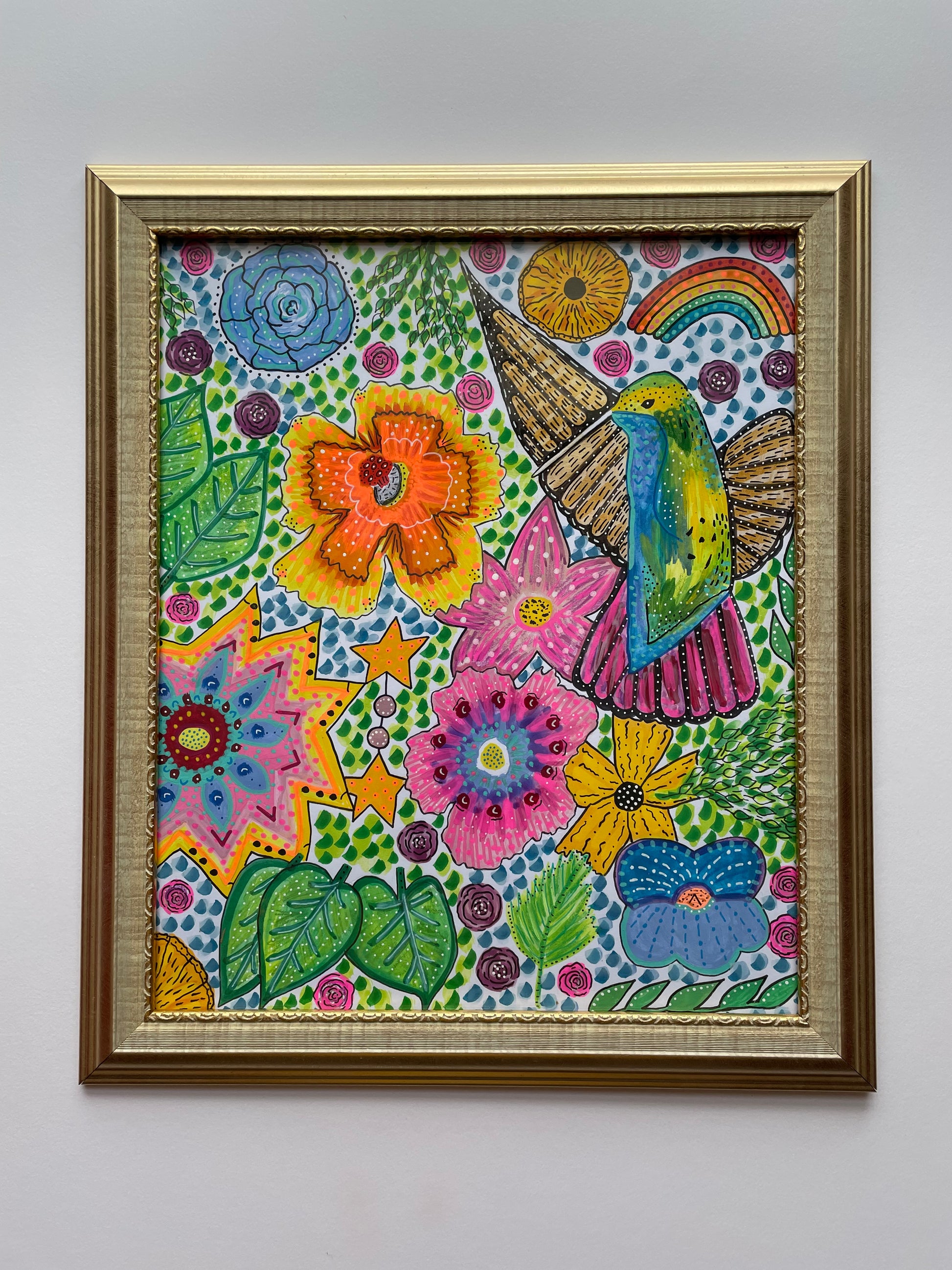 Hummingbird original painting in recycled gold frame. Size xxxxx.